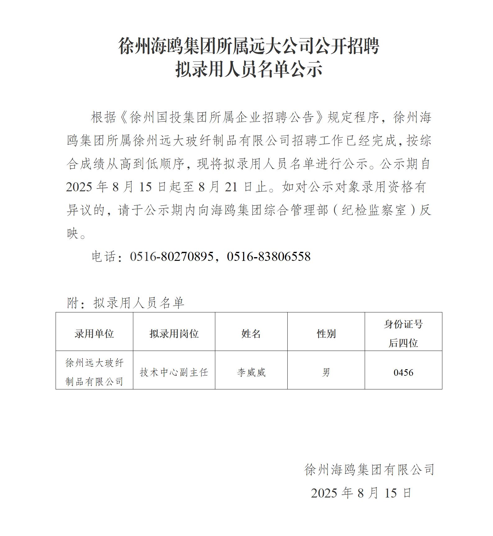 徐州海鷗集團(tuán)所屬遠(yuǎn)大公司公開招聘擬錄用人員名單公示