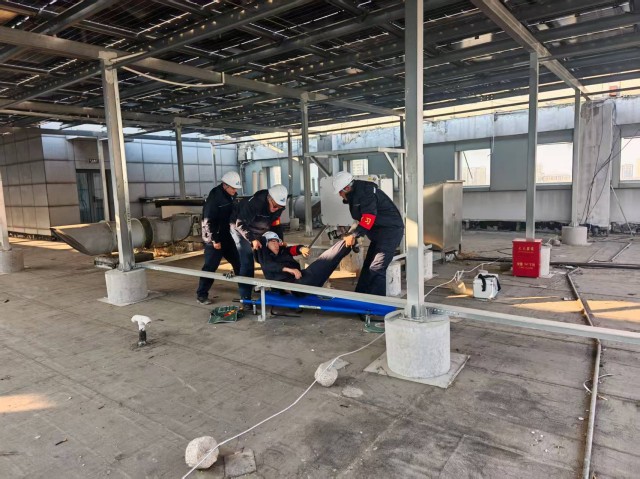 演練緊扣“安全第一、預(yù)防為主、綜合治理”方針,模擬電站運(yùn)維人員在屋頂進(jìn)行逆變器檢修時(shí),不慎觸及裸露電纜導(dǎo)致觸電昏迷的緊急場(chǎng)景?;顒?dòng)現(xiàn)場(chǎng),隨著總指揮一聲令下,演練正式拉開序幕。參演人員迅速進(jìn)入角色,從事故發(fā)現(xiàn)、電源切斷、脫離電源、現(xiàn)場(chǎng)救護(hù)到啟動(dòng)心肺復(fù)蘇、撥打急救電話,整個(gè)流程緊張有序、銜接緊密。現(xiàn)場(chǎng)救援人員反應(yīng)迅速、操作規(guī)范,充分展現(xiàn)了扎實(shí)的安全技能和高效的團(tuán)隊(duì)協(xié)作能力。